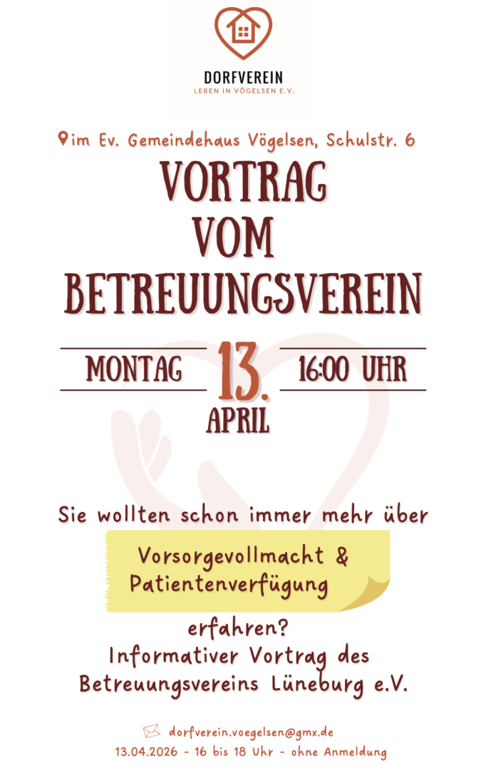 Vortrag vom Betreuungsverein Lüneburg e.V. zum Thema Vorsorgevollmacht und Patienentenverfügung: am Montag, den 13. April 2026 um 16:00 Uhr (bis 18:00 Uhr) im Ev. Gemeindehaus Vögelsen, Schulstraße 6. Eine Anmeldung ist nicht erforderlich.